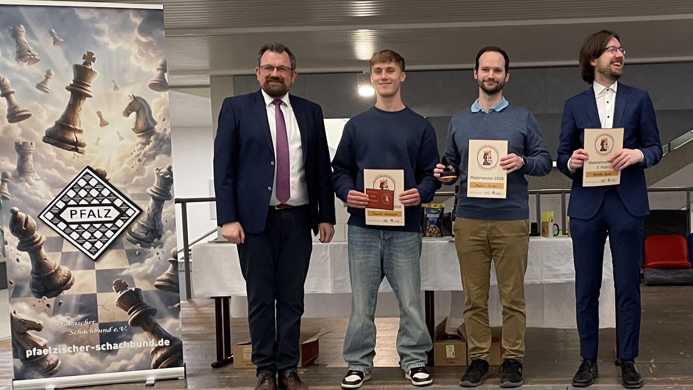 Die einzige reine Weste in allen Meisterturnieren hat Daniel Kuhn vom SK Landau. Er gewann alle vier Spiele und führt die Tabelle mit einem Punkt Vorsprung an. In Lauerstellung liegen Oliver Prestel (SK Frankenthal) und der starke Jugendliche Nicolas Wagener von den Schachfreunden Limburgerhof (Jahrgang 2013). Auf ihn warten in den nächsten zwei Runden die Favoriten Kuhn und Prestel. Wir dürfen gespannt sein. Für Nicolas, der schon seit Jahren viele Turniere spielt, ist der Kongress Aufgalopp für einige kommende Aufgaben: so ist er bei der U14 RLP Jugendmeisterschaft vom 07.04.-11.04.2026 in Pirmasens auf Platz 1 der Setzliste zu finden, die Deutschen Meisterschaften im Mai sind sicher auch ein Ziel.