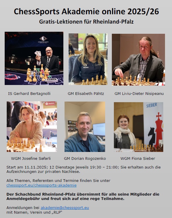 27.10.2025 Der Schachbund Rheinland-Pfalz hat die Teilnahmegebühren an der Trainings- und Fortbildungsreihe der ChessSports Akademie 2025/26 für alle Vereine des SBRP übernommen. Das bedeutet, dass alle Vereine des SBRP (und damit auch des PSB) und deren Mitglieder an den Zoom-Online-Vorträgen von namhaften Referentinnen und Referenten wie z.B. GM Elisabeth Pähtz, GM Dorian Rogozenko, GM Liviu-Dieter Nisipeanu oder IM David Lobzhanidze kostenlos teilnehmen können.